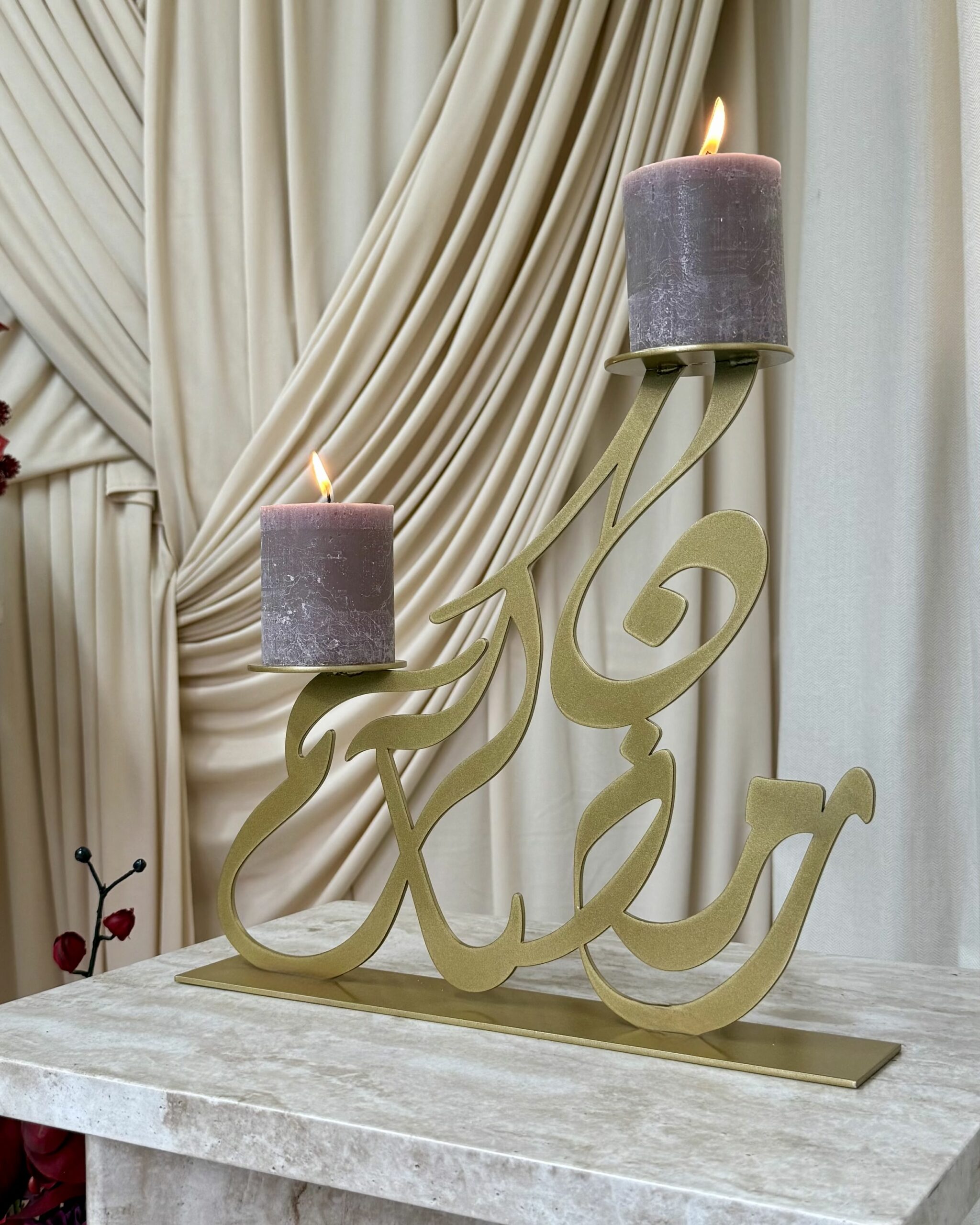 At the heart of the set is our premium steel candle holder, handcrafted from weighty steel and finished with elegant Arabic calligraphy. Each piece is made to order in Yorkshire by skilled metal artisans, offering a timeless balance of modern design and cultural significance. Choose from three calligraphy designs — Ramadan Kareem, Eid Mubarak, or Our Home Is Your Home — and personalise your piece in a selection of classic, décor-friendly colours: Gold, Chocolate Brown, Bronze, Black, and Taupe. For the perfect fit, we recommend a candle with a 7cm diameter.
